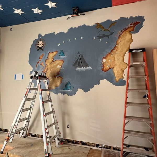 The wall map depicts our combined heritages . Matt being of Scottish heritage and Cole being Norwegian. A Highlander and a Viking, what could go wrong?